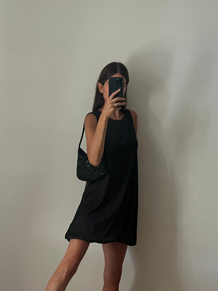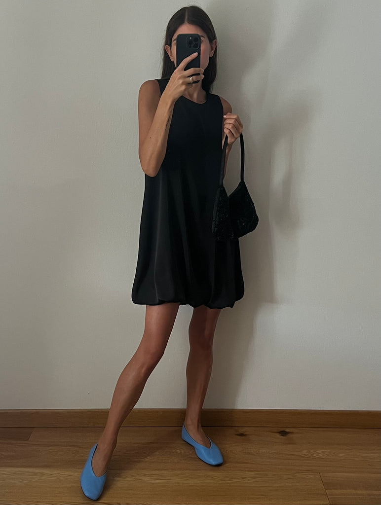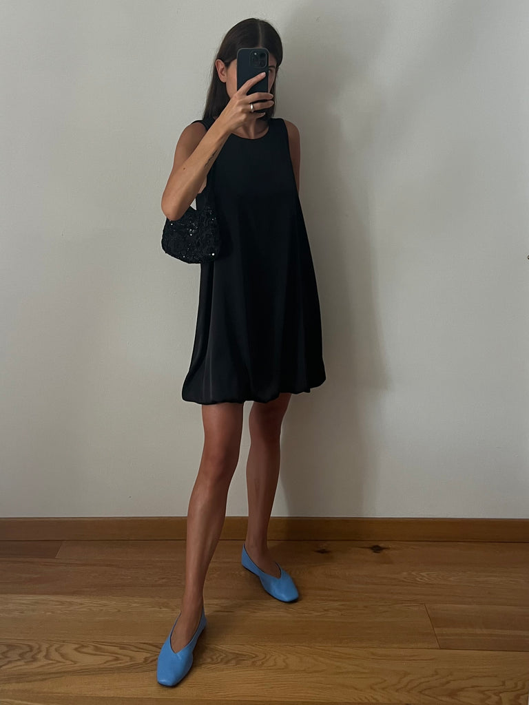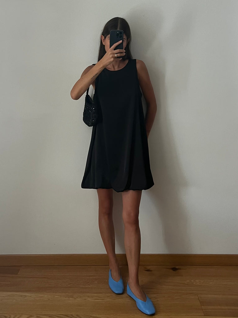 Vestito corto a palloncino, senza maniche, girocollo