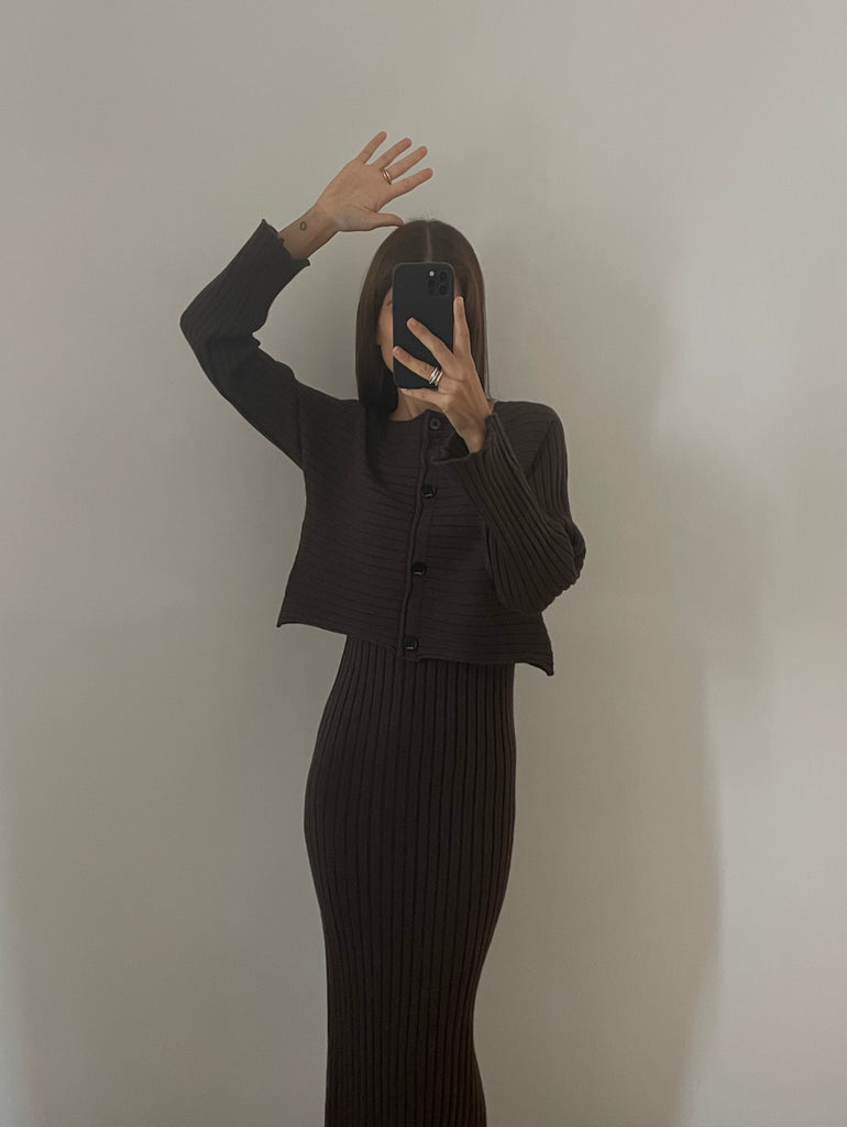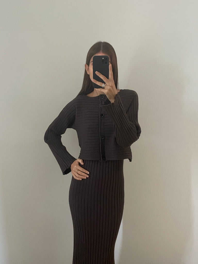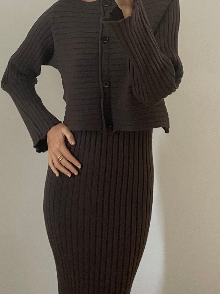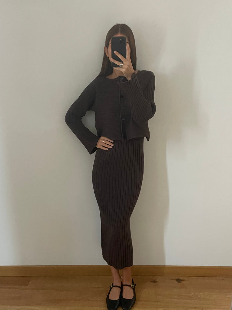 Completo composto da tubino in maglia a coste con scollo a V e maglia cordinata con finti bottoncini