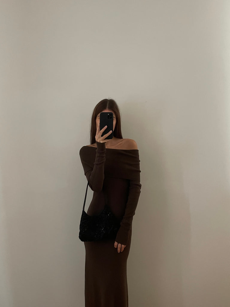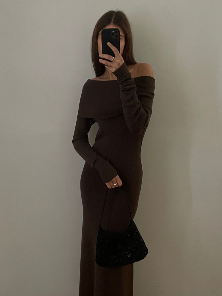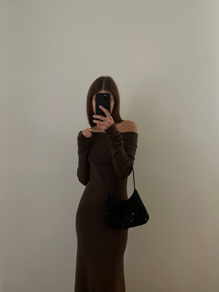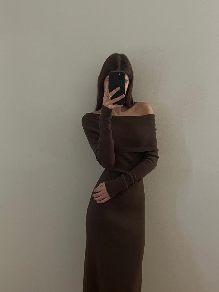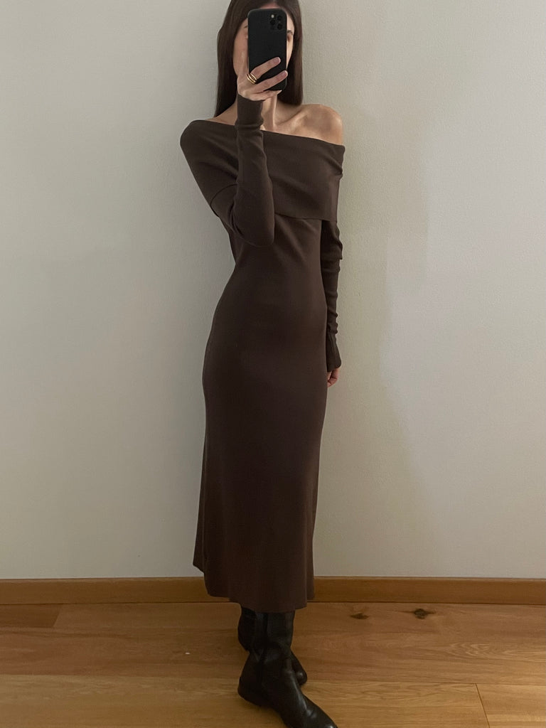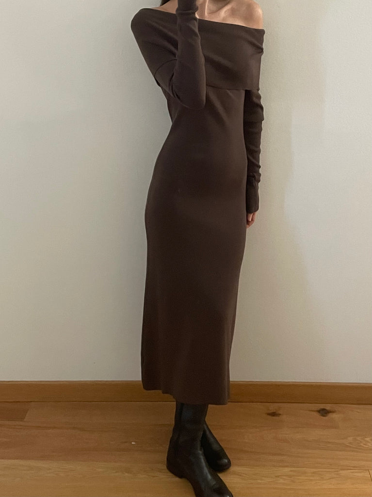 Vestito in maglia con spalle scoperte e e con ampio bordo superiore risvoltato e maniche lunghe.