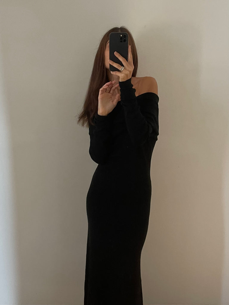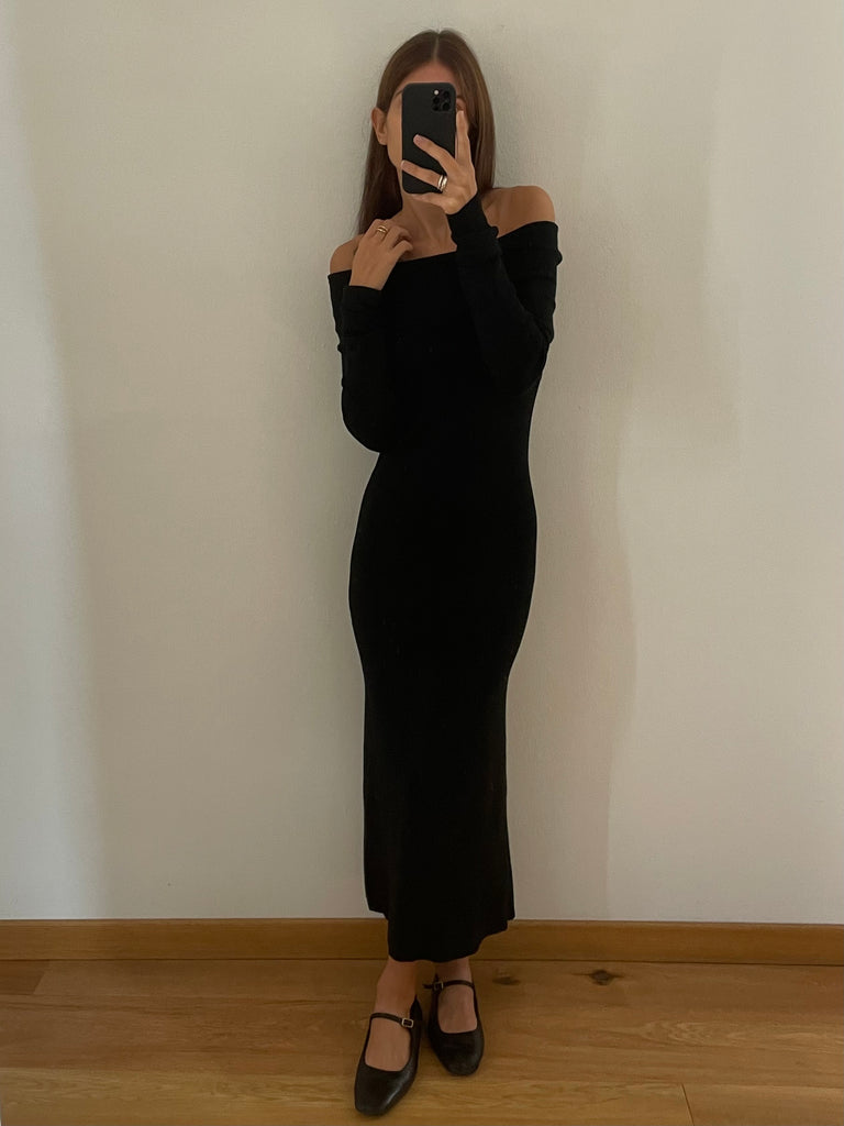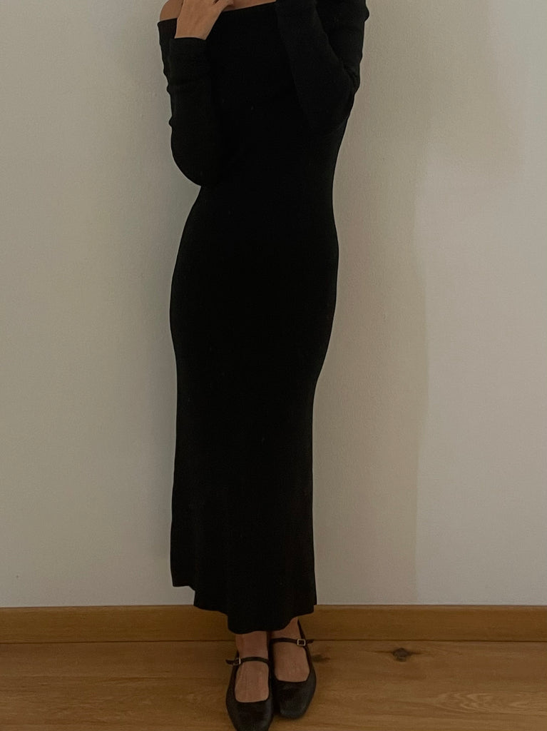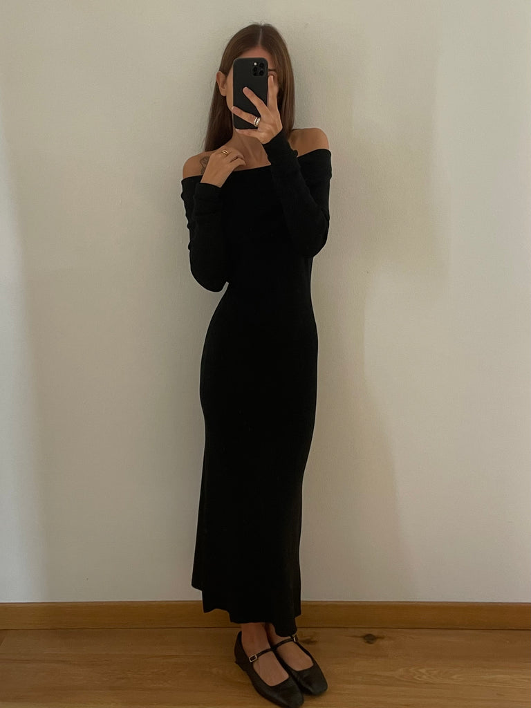 Vestito in maglia con spalle scoperte e e con ampio bordo superiore risvoltato e maniche lunghe.