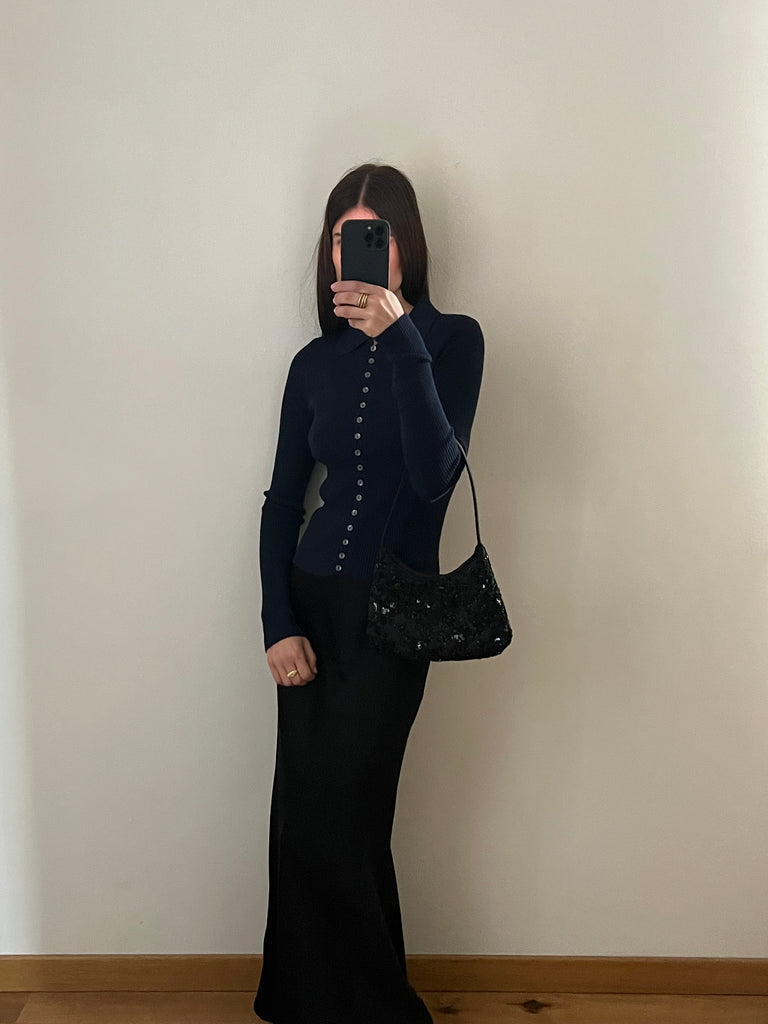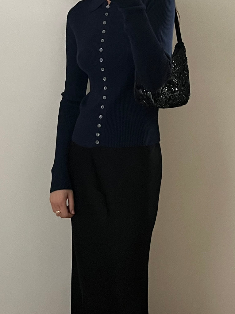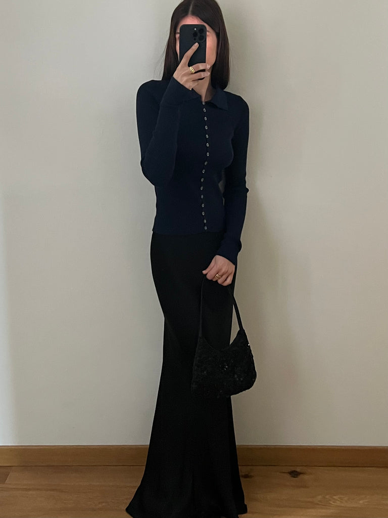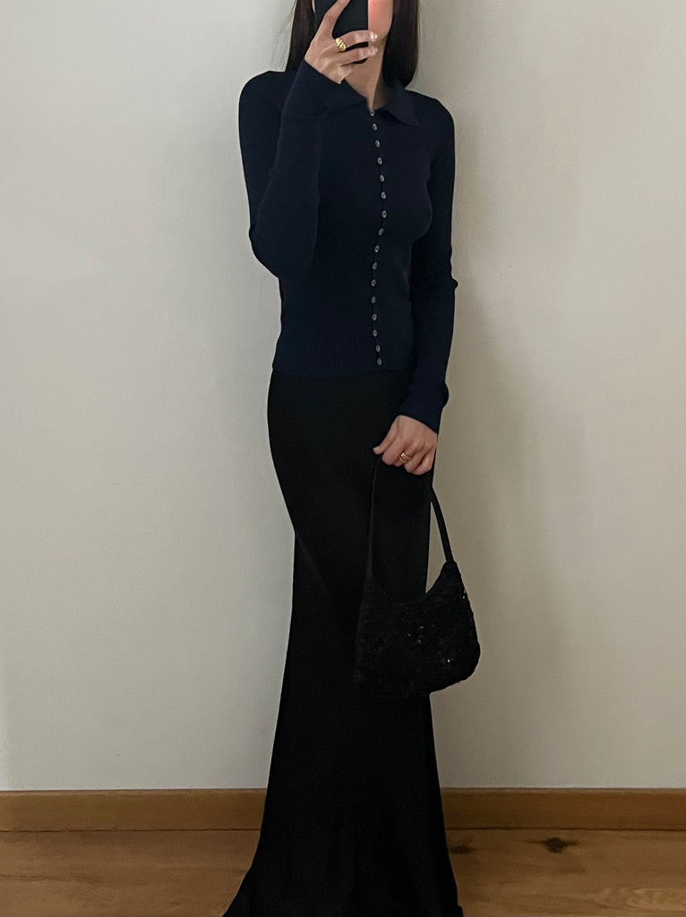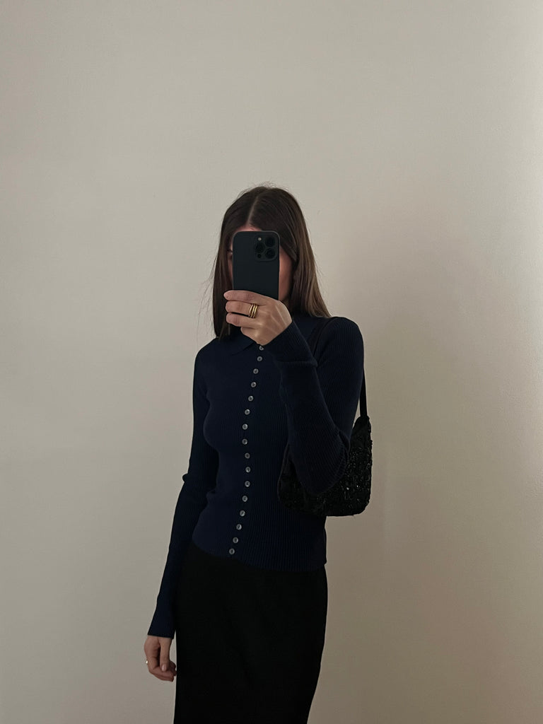 Collo a Revere stile polo e maniche lunghe, chiusura frontale con bottoni.