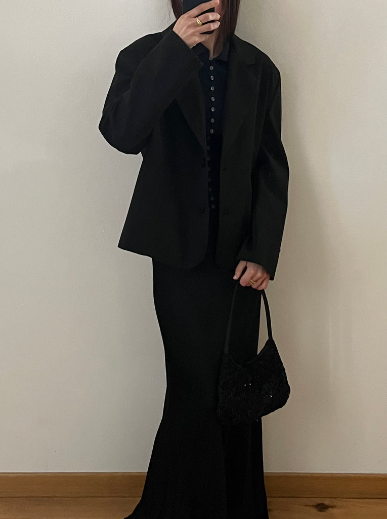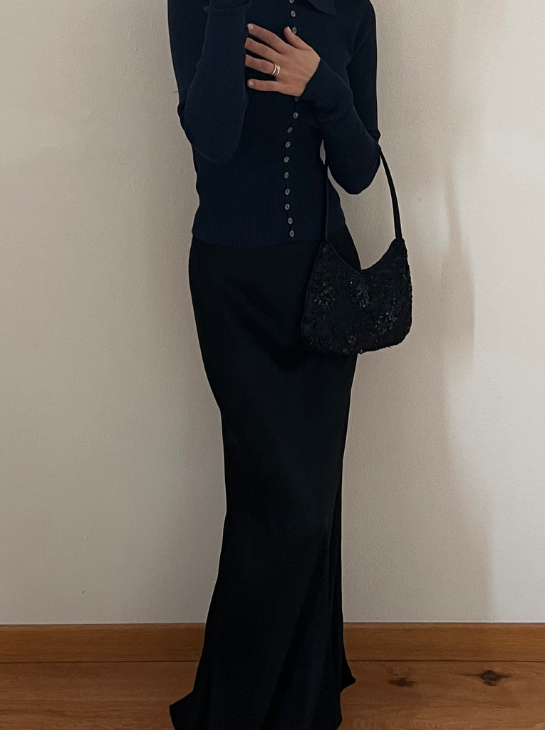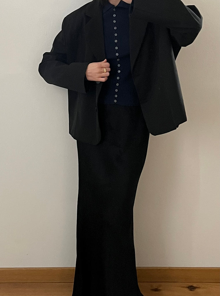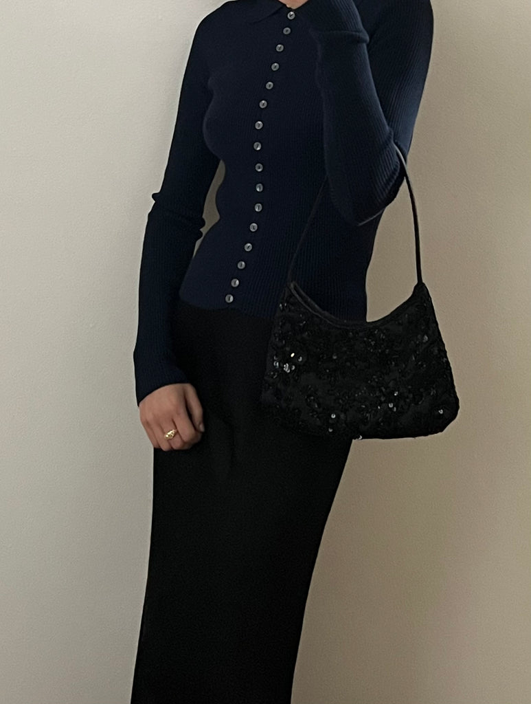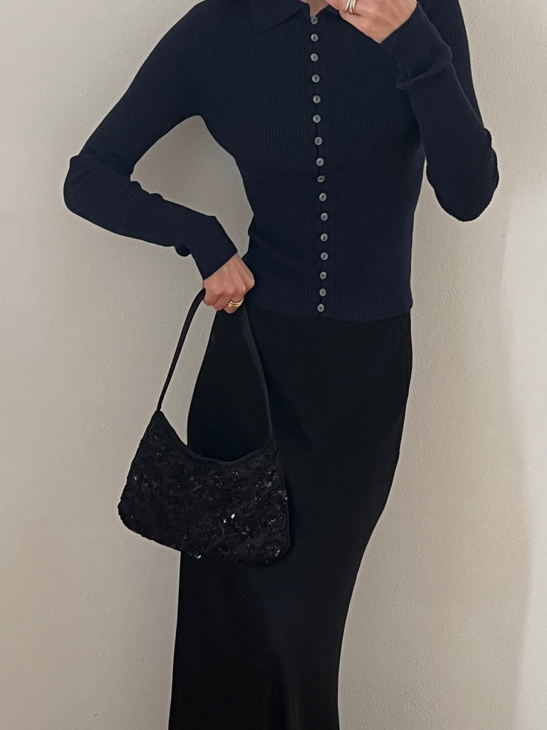 Collo a Revere stile polo e maniche lunghe, chiusura frontale con bottoni.