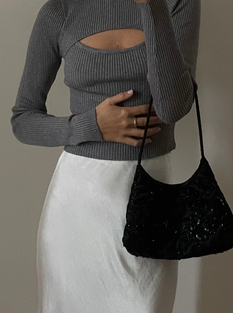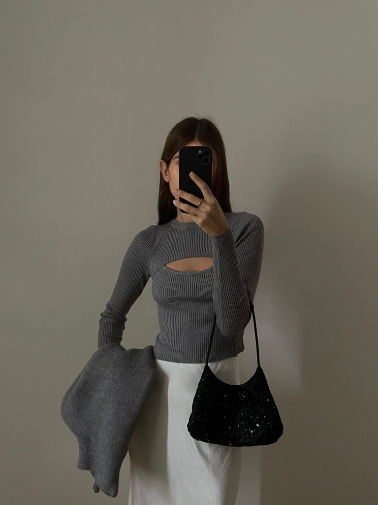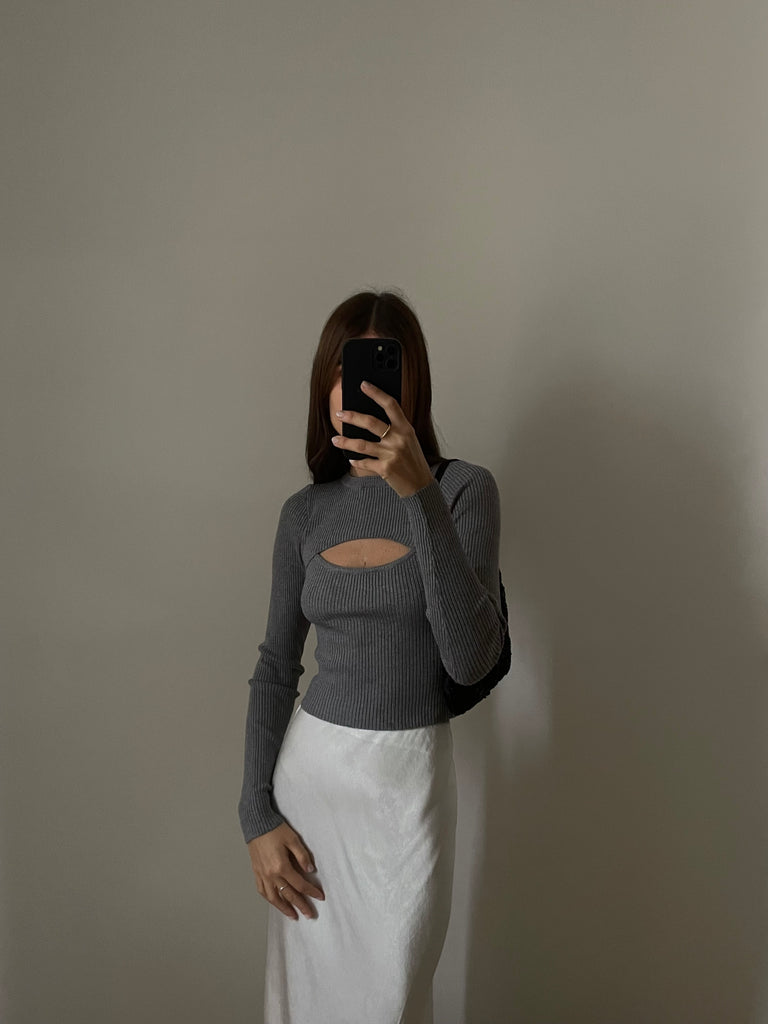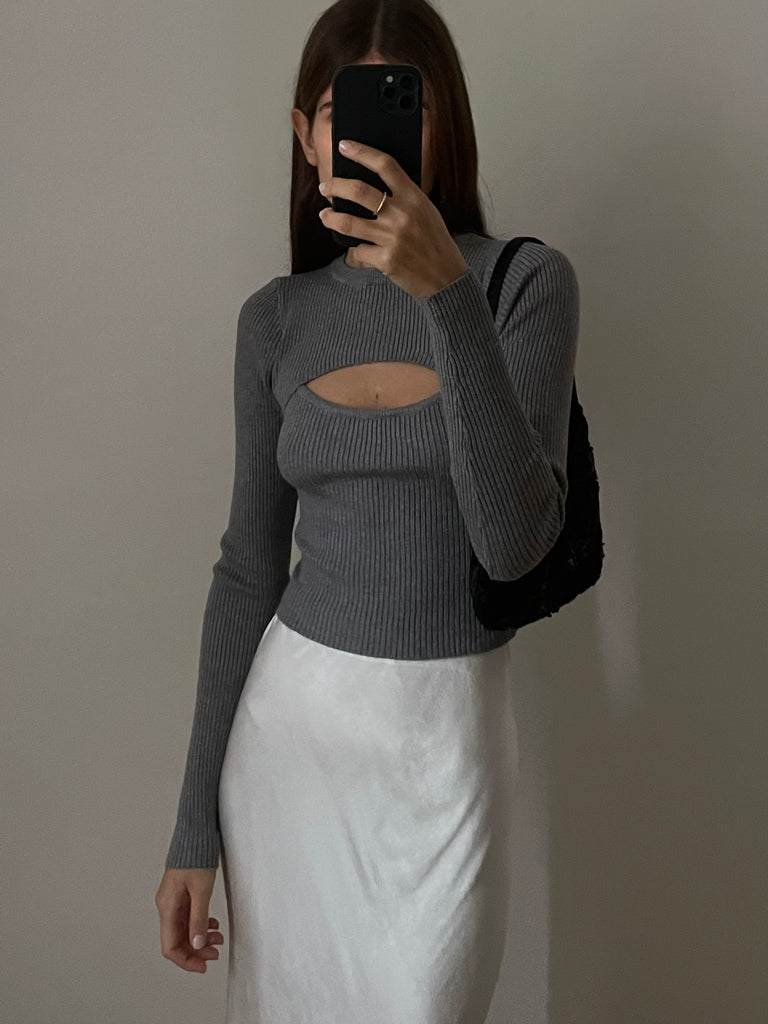 Pullover giro collo in maglia a costine con scollo cut out al centro e maniche lunghe.