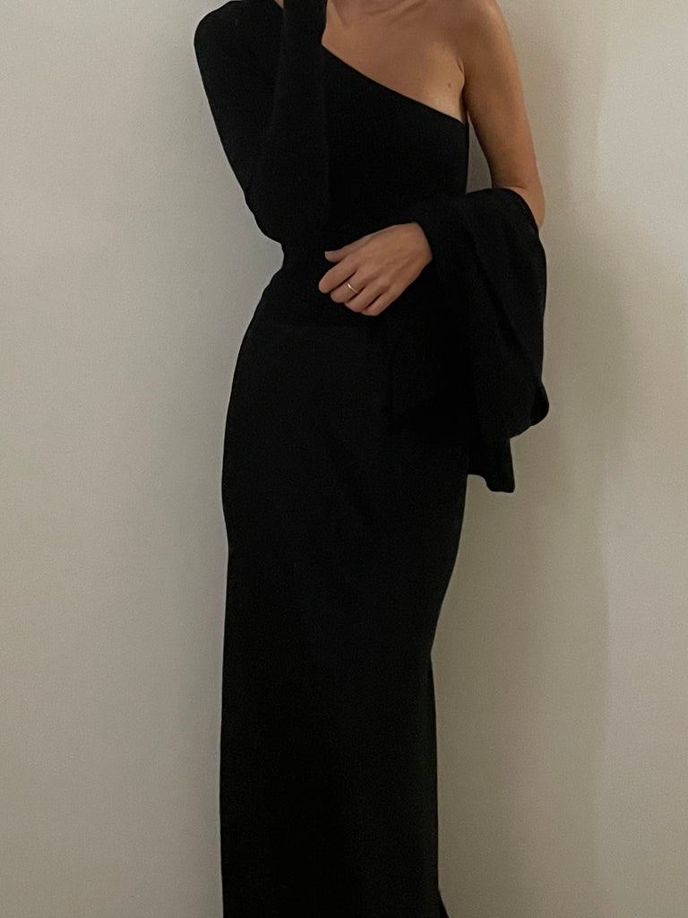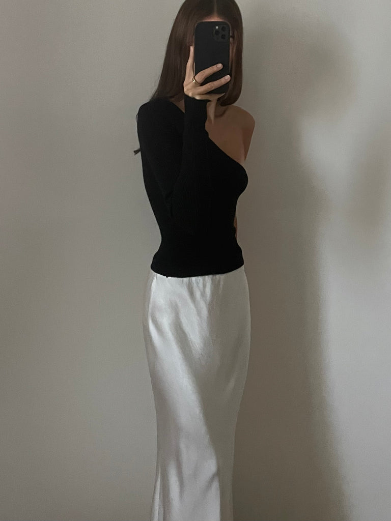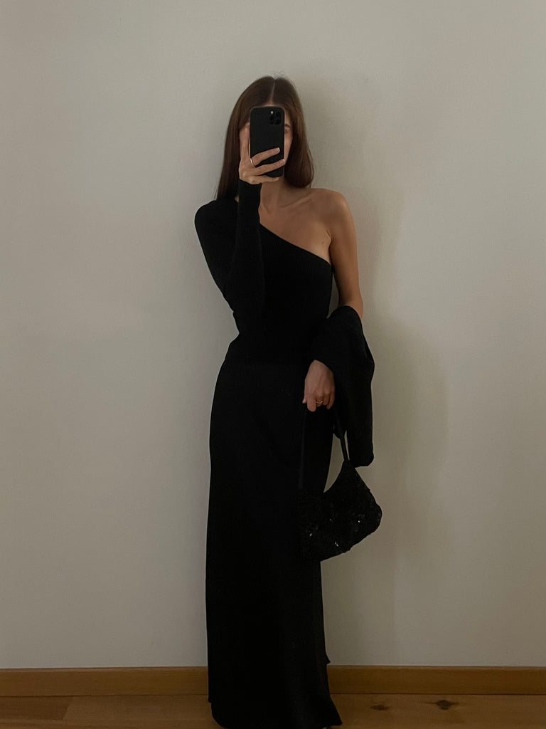 Scollo asimmetrico con una spalla ribassata e una manica lunga.