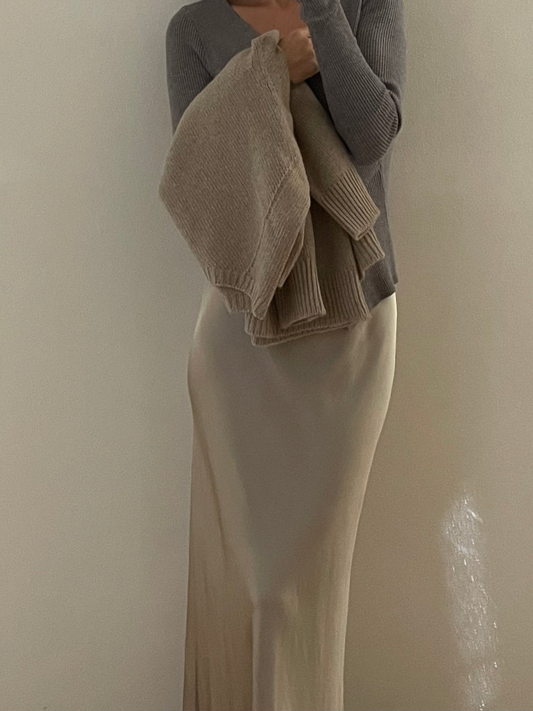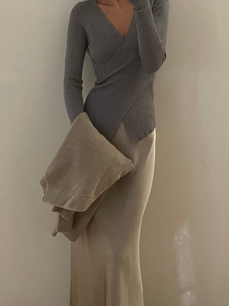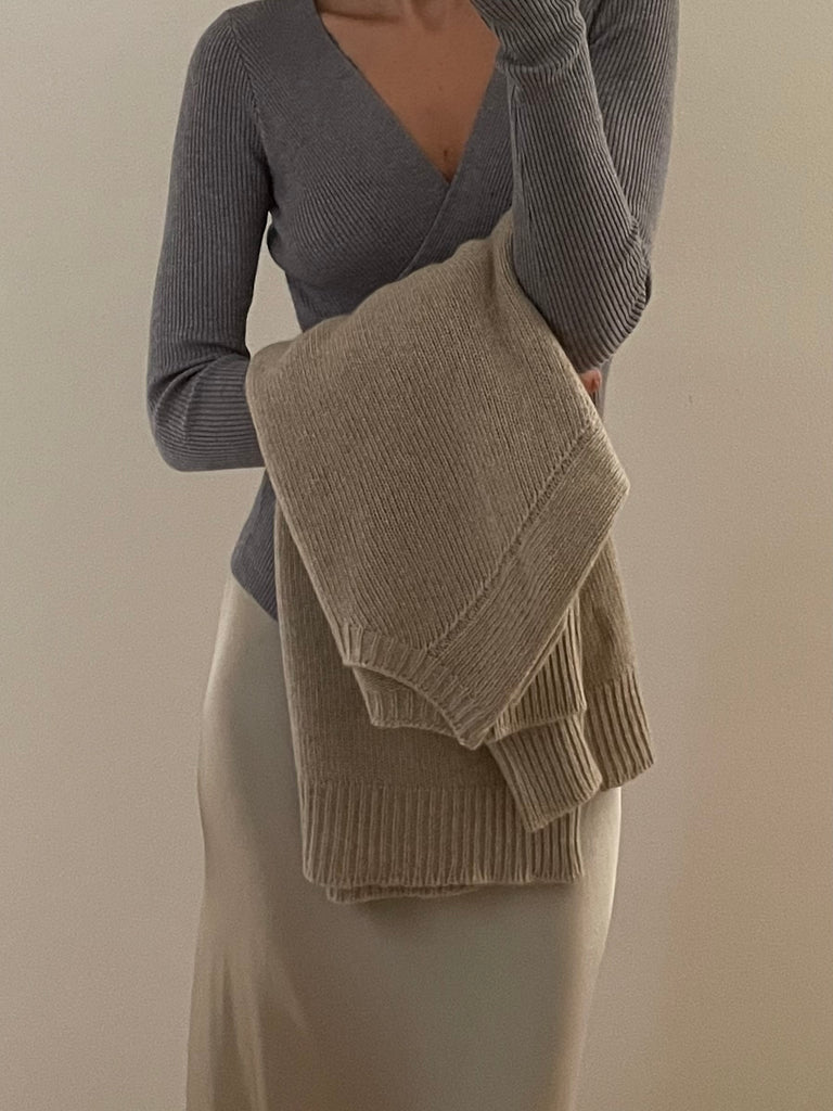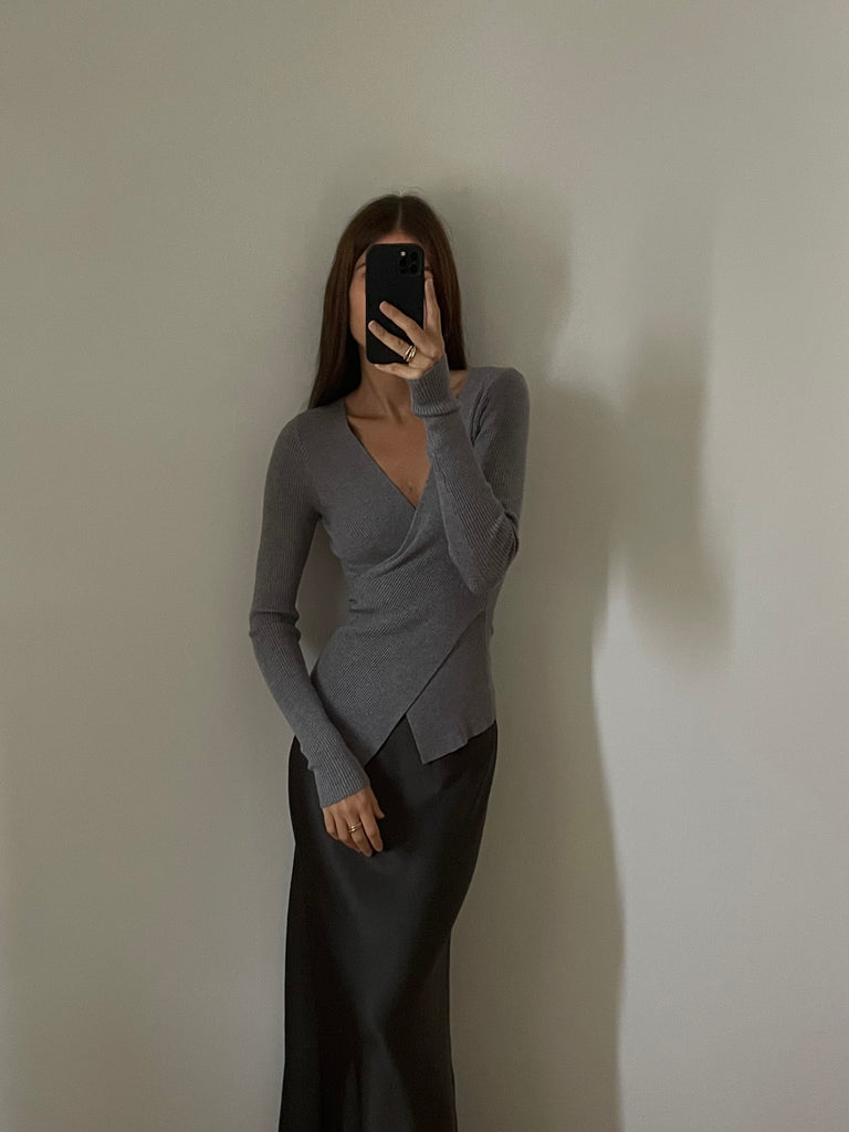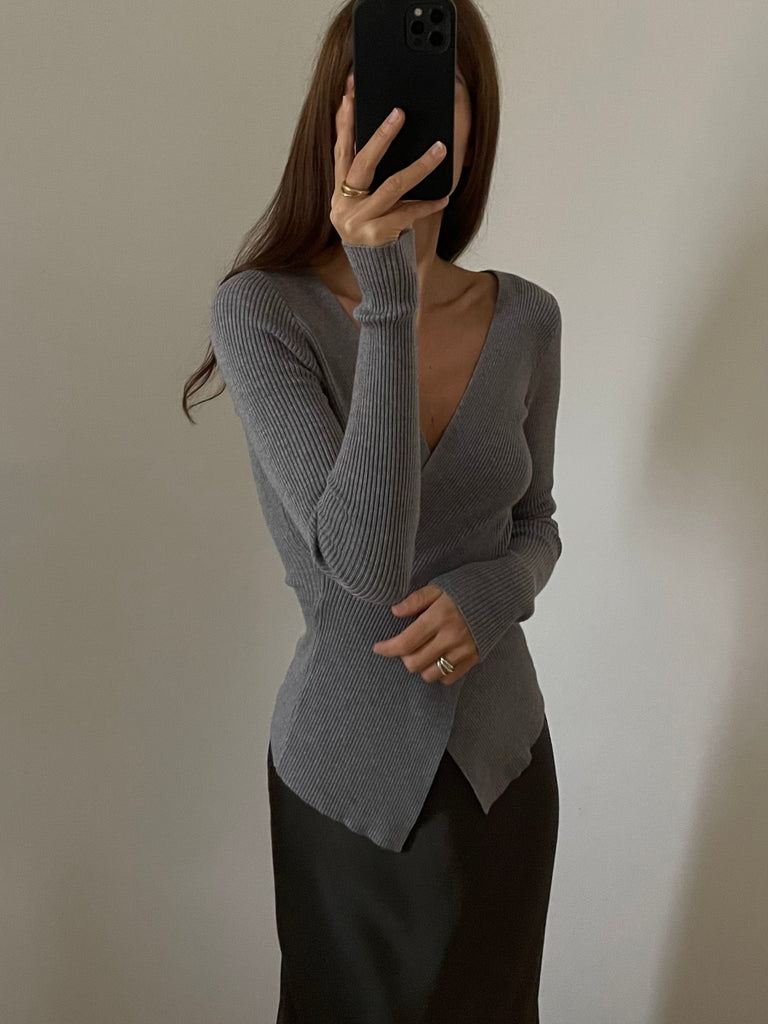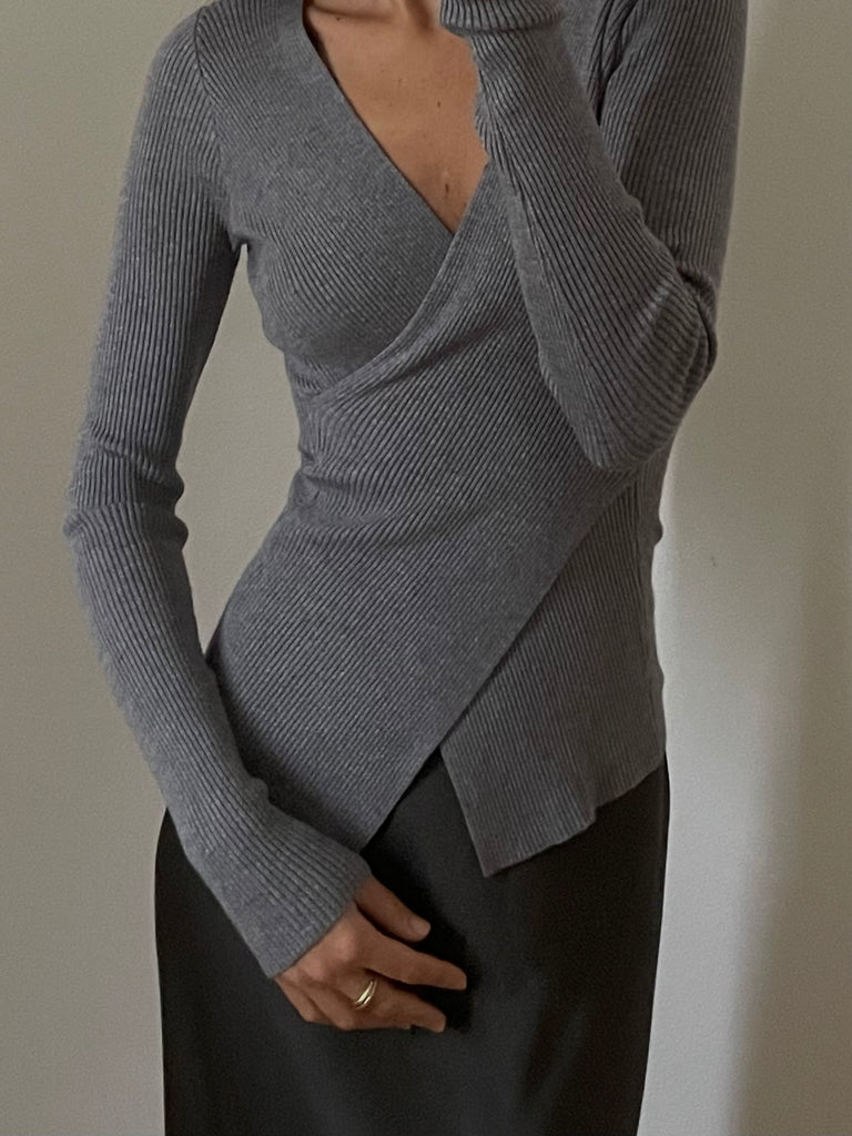 Pullover in maglia a costine, scollo a V incrociato.