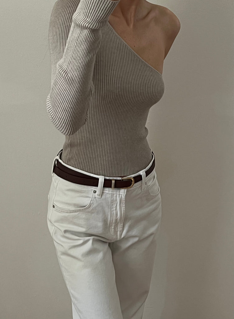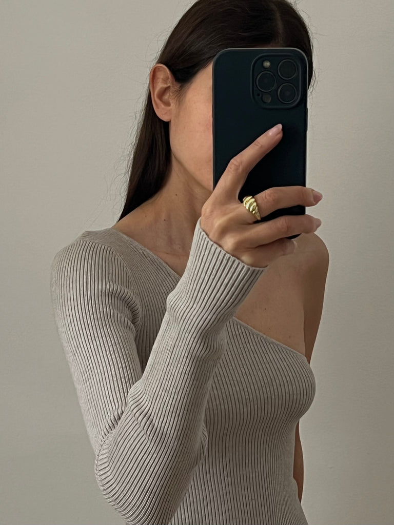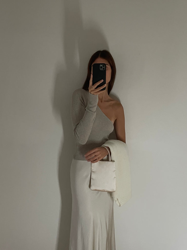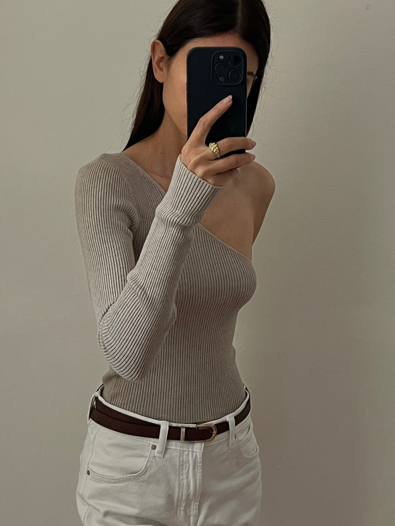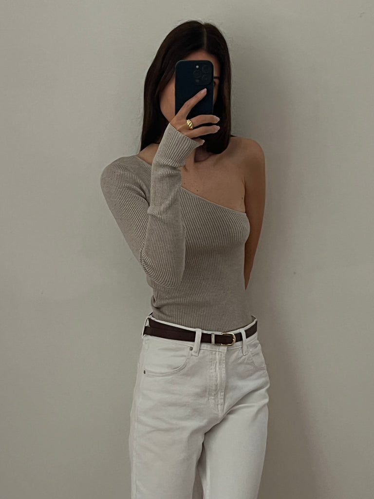 Scollo asimmetrico con una spalla ribassata e una manica lunga.