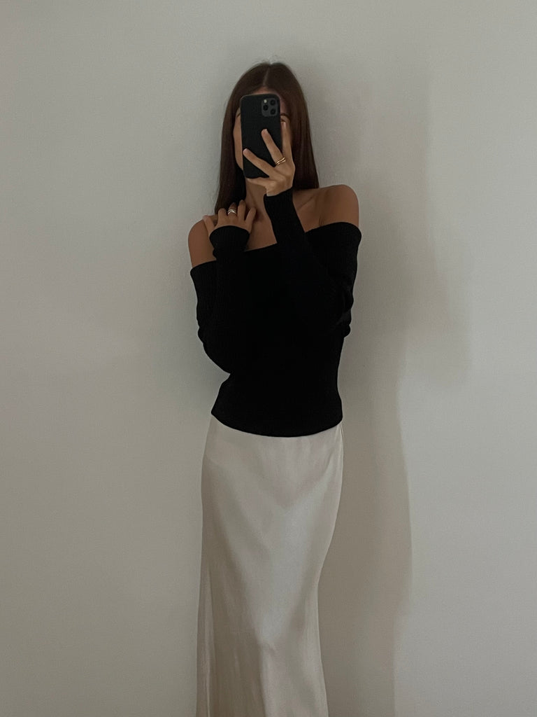 Pullover a spalle scoperte, in maglia a costine e con ampio bordo superiore risvoltato e maniche lunghe.