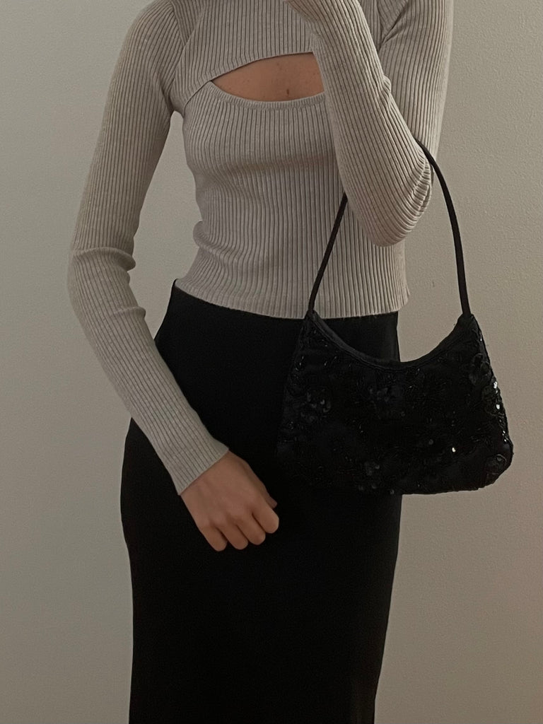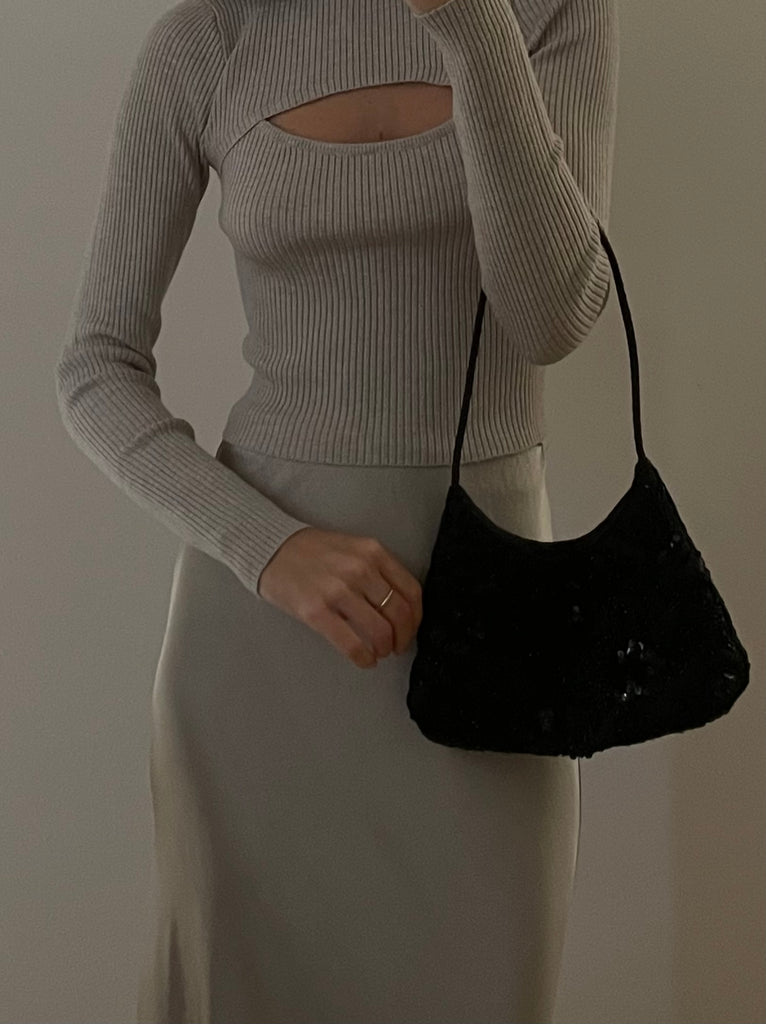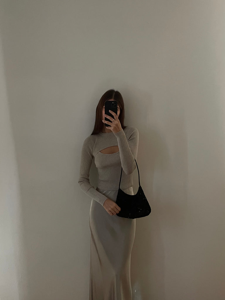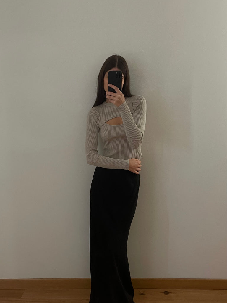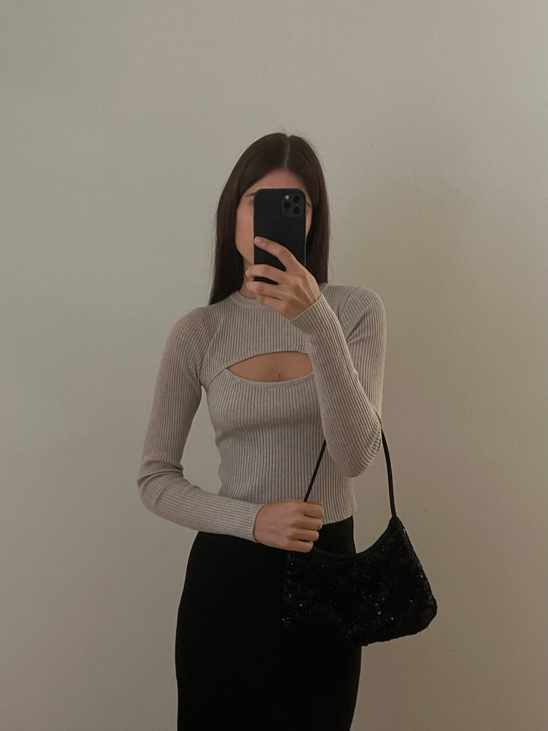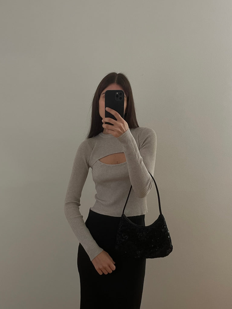 Pullover giro collo in maglia a costine con scollo cut out al centro e maniche lunghe.
