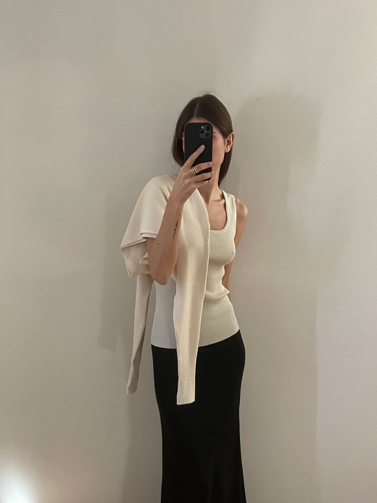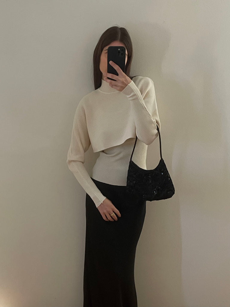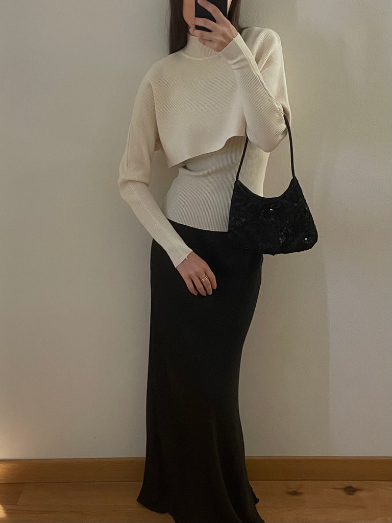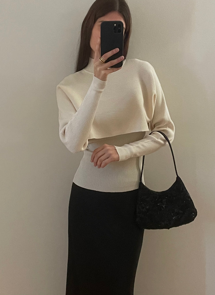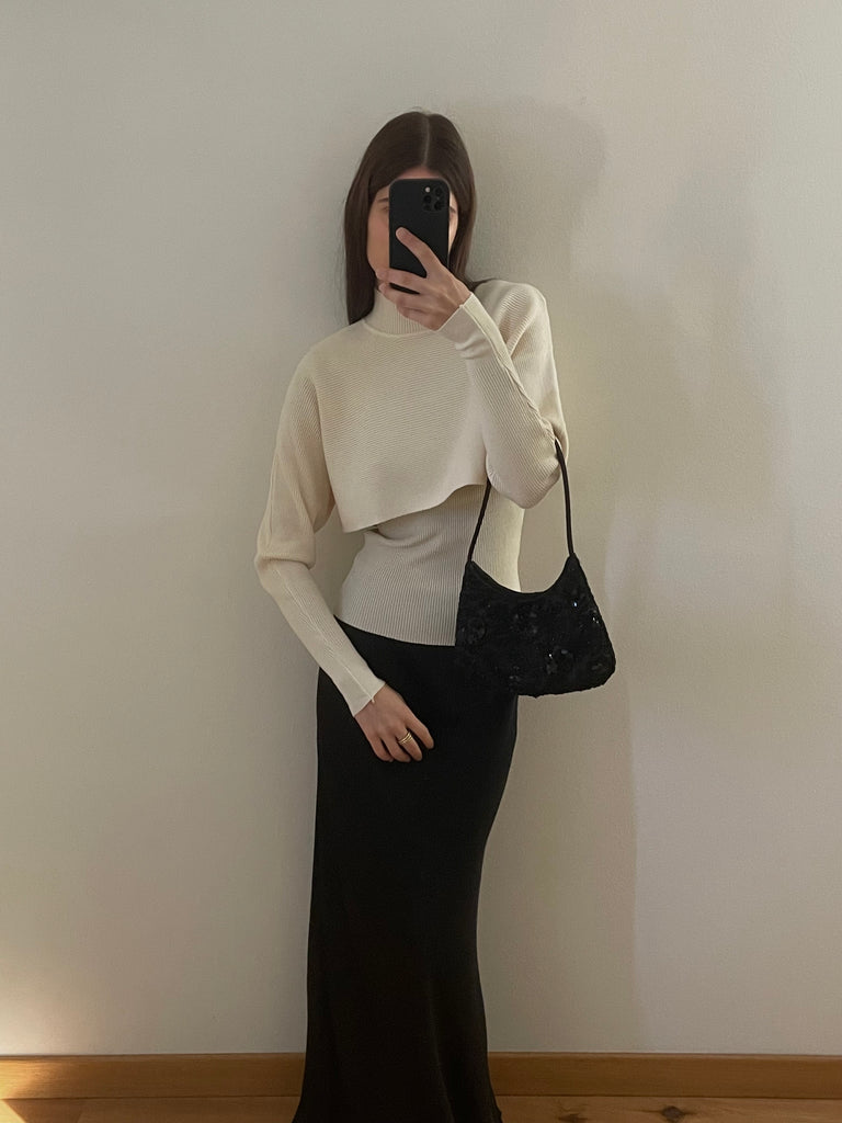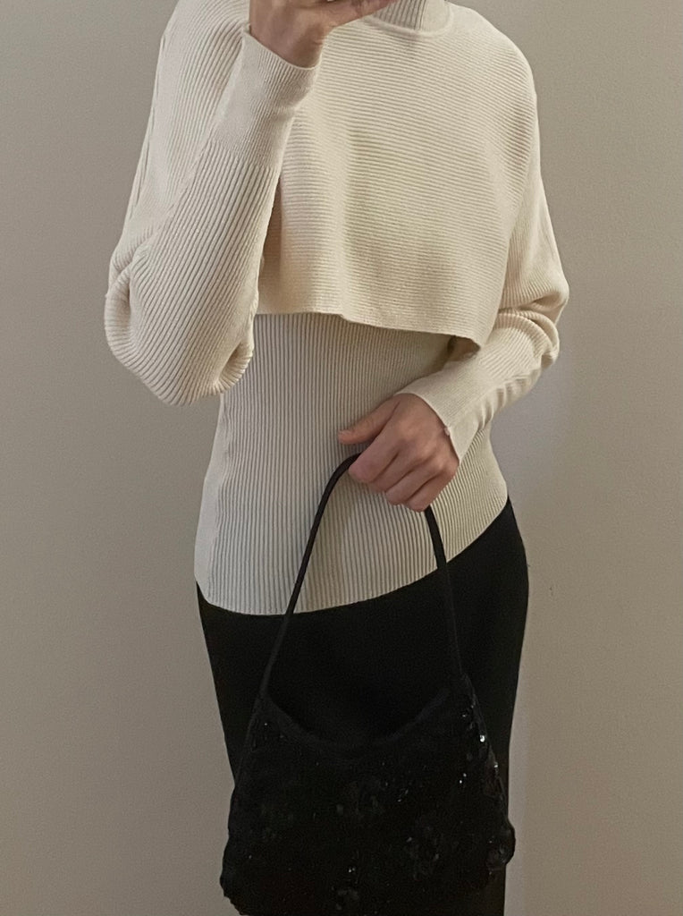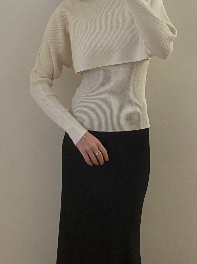 Completo composto da pullover in maglia a coste orizzontali, con mezzo collo e maniche lunghe.